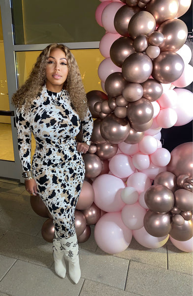 Our Dalmatian Bodycon Dress features long sleeves with a mock neck and back zipper closure. 95% polyester 5% spandex.