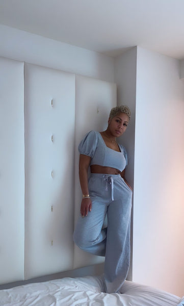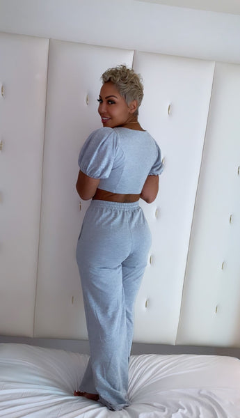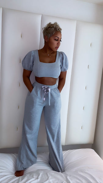 Grey Days Pants Set is a two-piece crop top and wide-leg pant set.