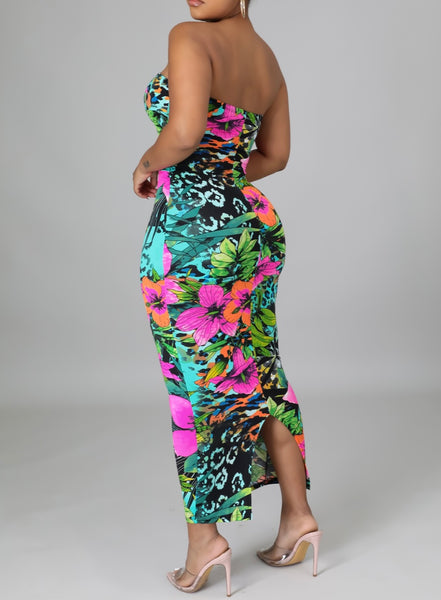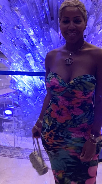 Our It's A Vibe Dress is strapless with knot detailing and a small triangle cutout in the front. This stretch dress is 95% polyester and 5% spandex.
