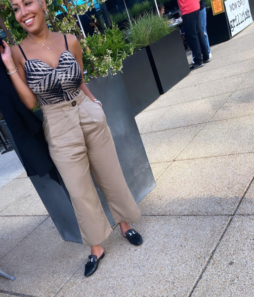 Our Work and Play Crossover Culottes feature a high waist, stretchy back waistline, asymmetrical wrap front with faux button closure. These culottes are wide-legged with pockets. These are perfect for a day in the office or an afternoon out with friends.