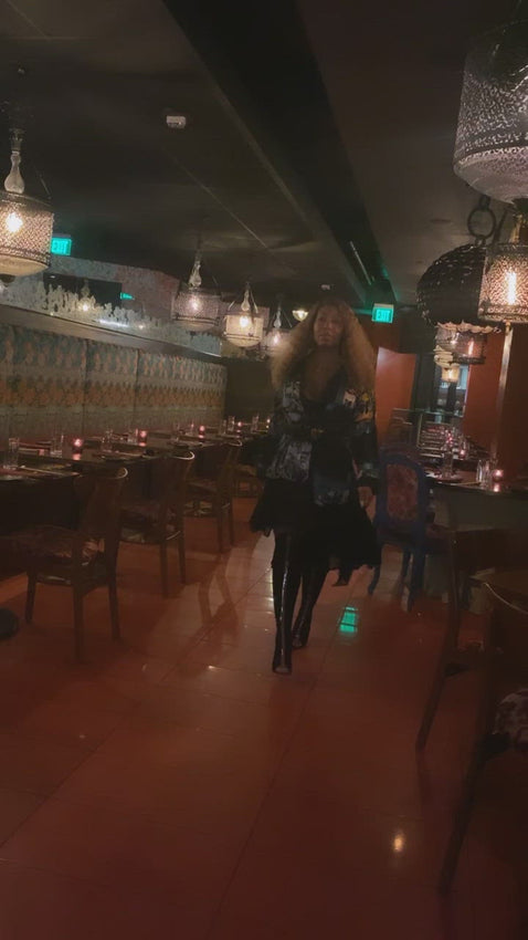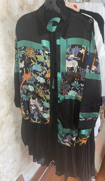 The Diahann shirt dress feature a full button-up front, a pleated sheer asymmetrical hem and side vents.